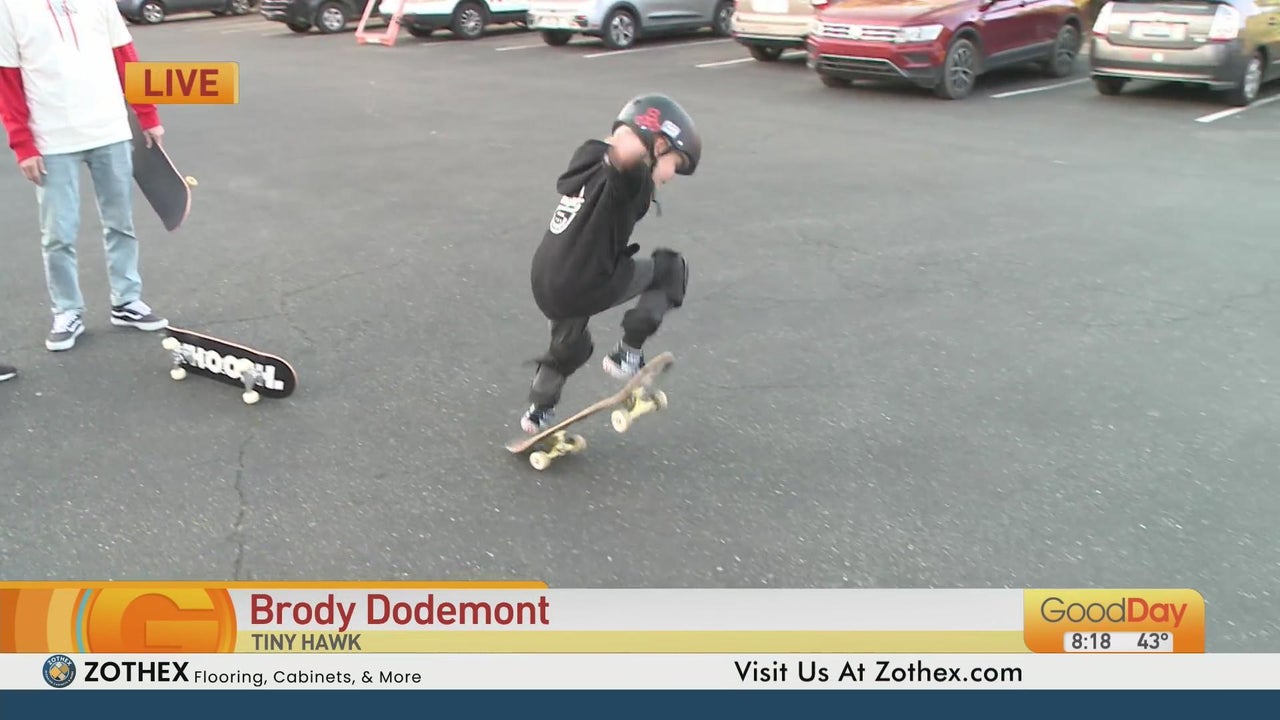 "Tiny Hawk" is 4-year-old Brody, our friend Lori Wallace introduced us to him 2 years ago! Brody and his dad Shane are out on the Good Day lot with Tina to show her some moves!