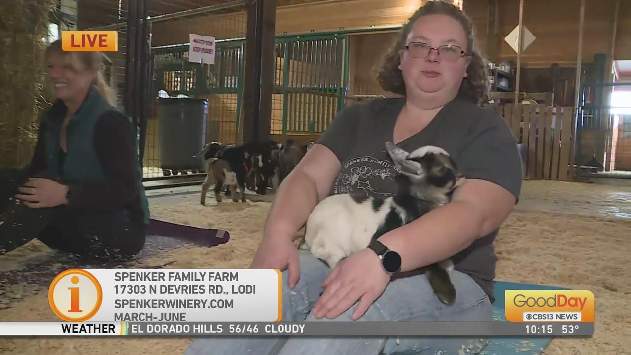We talk to one of the owners of the Spenker Family Farm as she shows us their prized goats doing yoga!