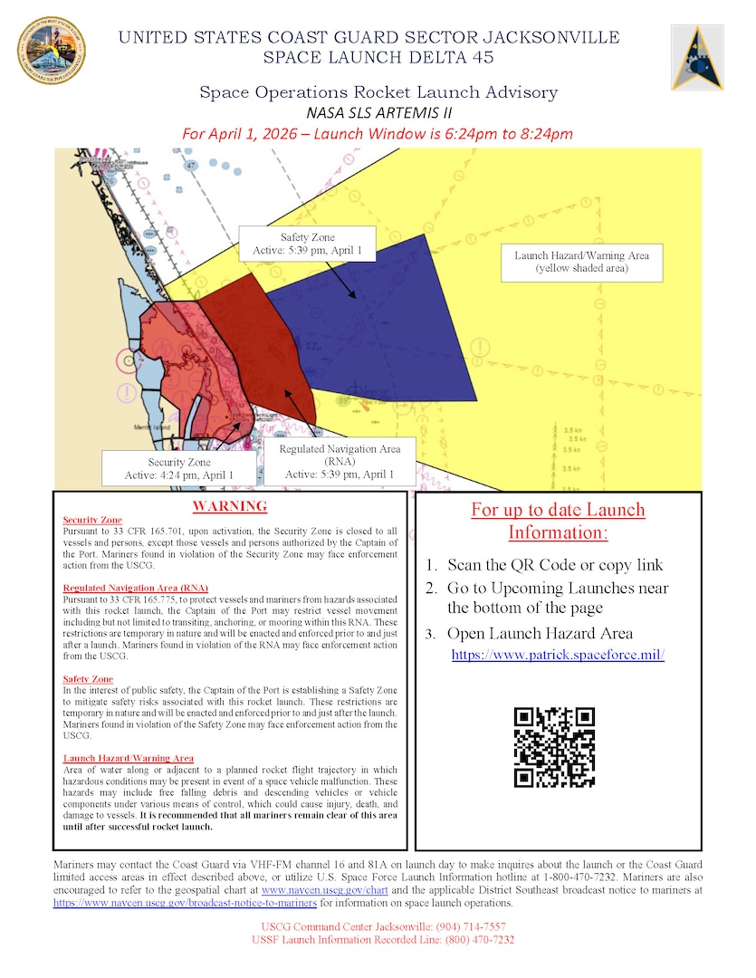 In the hours leading up to launch, Coast Guard crews establish a "security zone," "safety zone" and "regulated navigation area," which cannot be transited without formal approval.