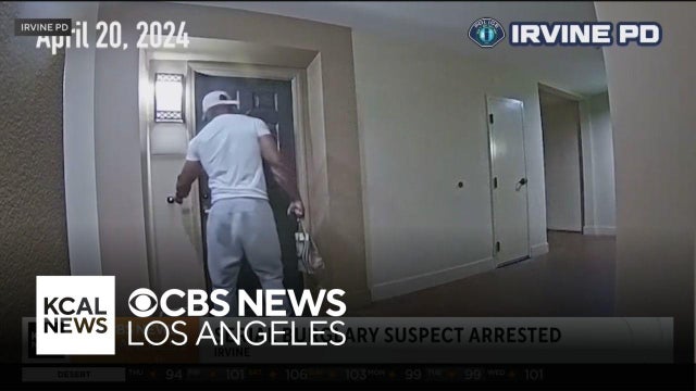 Irvine police have arrested a man accused of burglarizing homes while posing as a food delivery driver, with videos showing the suspect holding a paper bag and cellphone as he approached homes.