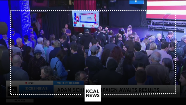 Laurie Perez continues coverage from the Avalon Theatre in Burbank, where voters are awaiting the official news that Rep. Adam Schiff has continued forward in his race for CA Senate.