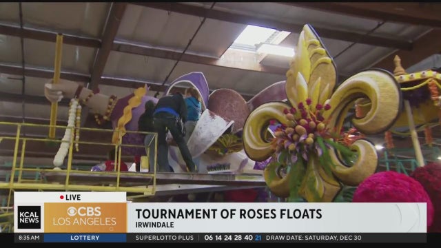 Kara Finnstrom, reporting from Irwindale, showcased the decorators' final efforts in finalizing their floats ahead of the Rose Parade, including on the "Explore Louisiana" float.