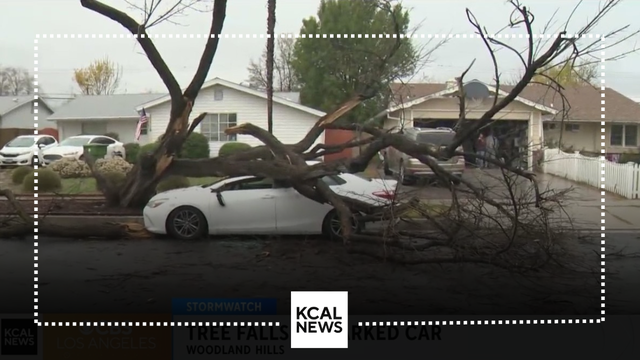 Luzdelia Caballero reports from Woodland Hills, where Monday's powerful weather knocked over a large tree and crushed a car.