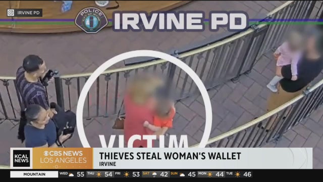 Surveillance footage captured the moment that two thieves took advantage of an unsuspecting mother waiting in line for the carousel ride at the Irvine Spectrum with her child.