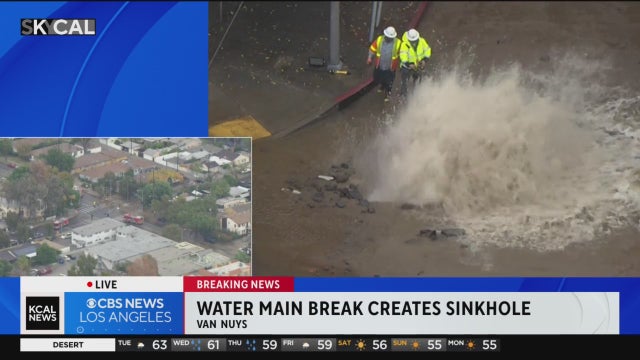 Crews are working to shut off a burst water main that has begun to create a sinkhole at a Van Nuys intersection.