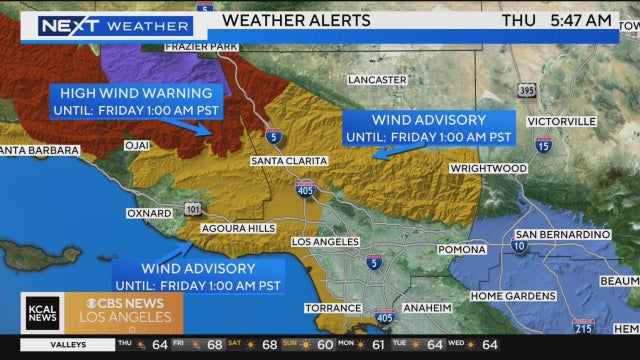 A high wind warning in effect for the mountain areas and the foothills in Ventura County until 1 a.m. on Friday. A wind advisory will be in effect for parts of LA County until 1 a.m. on Friday as well.