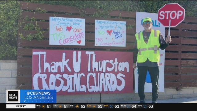 Michele Gile reports from Laguna Beach, where a crossing guard suffered an injury while working at Thurston Middle School when he was hit by a car after helping some kids across the street.