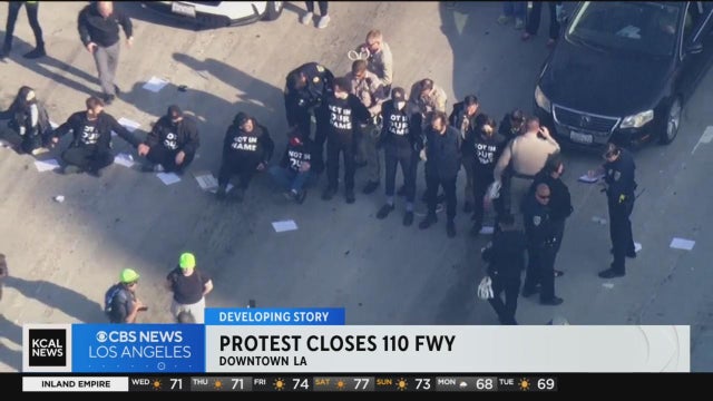 75 protesters demanding cease-fire in Gaza were detained after blocking the southbound lanes of the 110 Freeway at 3rd Street in downtown LA Wednesday morning.