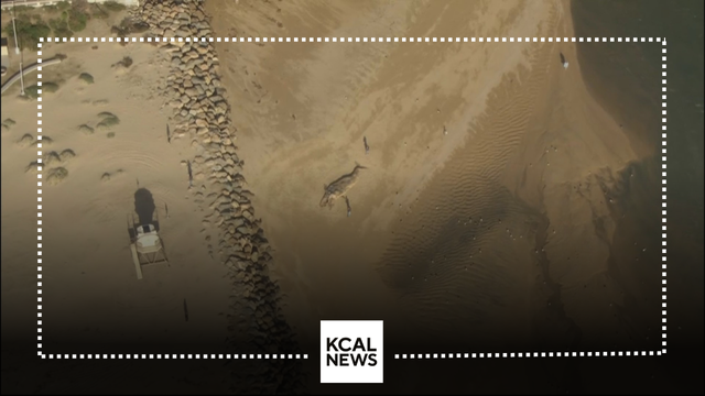 A dead whale washed up on the Huntington Beach shore.