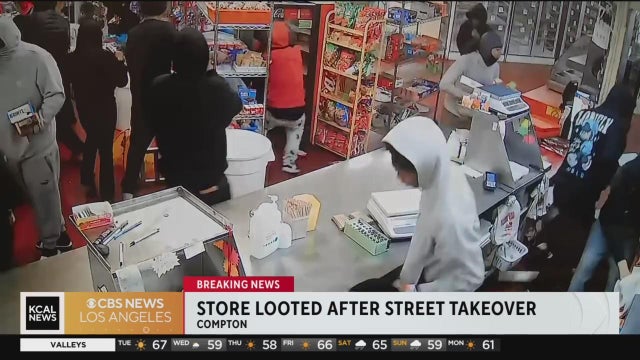 New video from the scene of a street takeover turned robbery shows the moments that a car rams the entrance to Ruben's Bakery in Compton before a mob of more than 100 people ransack the store.