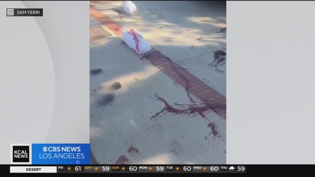 Los Angeles police launched a hate crime investigation after a pro-Palestinian group threw fake blood on the driveway of the president of a pro-Israel group in Brentwood on Thursday. Lauren Pozen reports.