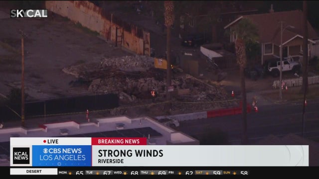 The strong winds claimed another victim on Monday, toppling the remnants of a building previously damaged in a fire in Riverside.
