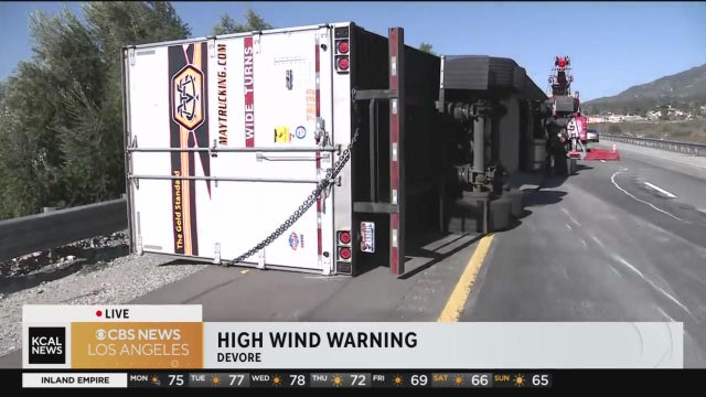 KCAL News reporter Kara Finnstrom is in Devore where strong winds caused a big rig to tip over on I-215. Traffic delays are expected as crews work to get the truck off the road.