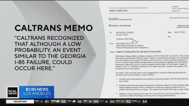 Caltrans engineers warned the department about the possibility of fires raging under freeways if flammable materials were allowed to be stored there. However, it appears these guidelines may have been ignored. David Goldstein reports.