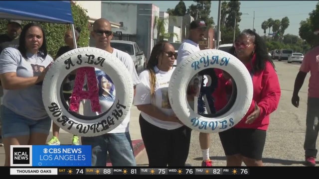 Families of Ryan Davis and Asia Boatwright gathered in Inglewood to place a ghost tire memorial near the site where their loved ones were killed in 2021 when they were t-boned by a drunk driver.