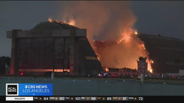 Michele Gile provides continued coverage from Tustin, where a massive fire continues to rage more than 15 hours after it was first reported. The blaze, which completely destroyed one of the two iconic WWII era blimp hangars, has elicited strong reaction from the community.
