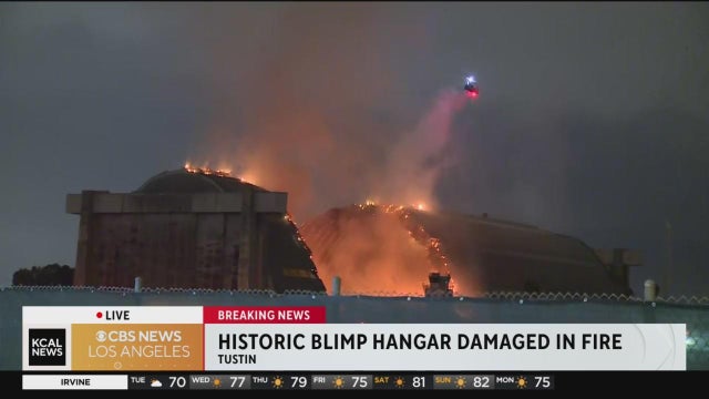 Firefighters in Orange County are working to put out a massive blaze that started at a blimp hangar in Tustin early Tuesday morning.
