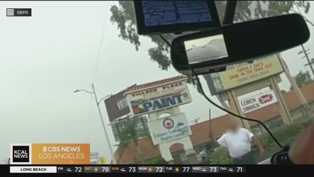 San Bernardino police use a bean-bag shotgun to detain a machete wielding man on the street