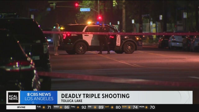 Los Angeles police are searching for three to four gunmen involved in a shooting that left three people dead and one injured in Toluca Lake Monday night. Jeff Nguyen reports.
