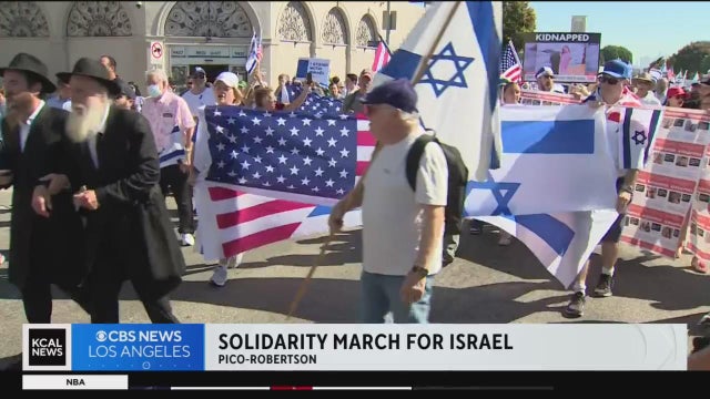 Hundreds of people gathered in West Los Angeles Sunday to express solidarity with Israel, one day after a similar march and rally took place in support of Palestinian rights.