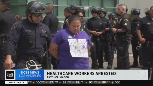 The LAPD has arrested 25 people for failing to disperse after an unlawful assembly was declared at a Labor Day march and demonstration by health care workers in East Hollywood. Jeff Nguyen reports.