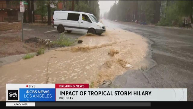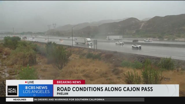 Lauren Pozen reports from Phelan, where Tropical Storm Hilary is causing strong gusts of wind and constant rain along the Cajon Pass, creating dangerous driving conditions for many heading through the area.