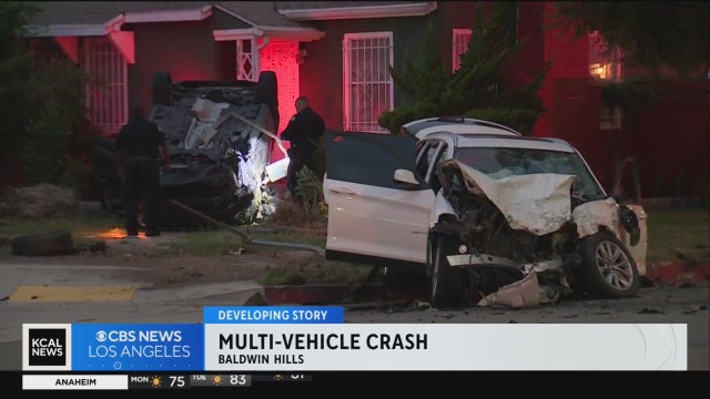 Joy Benedict reports from Baldwin Hills, where three suspects were arrested after fleeing from an attempted traffic stop by police officers early Monday afternoon, causing a crash just moments later. Seven people were injured in the four-car crash, but none of the injuries are considered to be life-threatening.