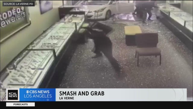 Nicole Comstock reports from La Verne, where authorities are investigating a violent smash-and-grab robbery in which a group of thieves drives into the front of a jewelry store, assault one of the employees and take off with nearly $300k in stolen goods.