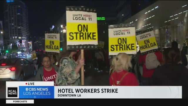 Lauren Pozen provides continued coverage from downtown Los Angeles, where striking hotel workers could be seen picketing outside of hotels on Monday evening. The strike, which started over the weekend, comes just before the Fourth of July holiday and with thousands of travelers visiting the area.
