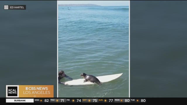 A seal pup has been greeting surfers and jumping onto their boards out in the water near Pacific Beach in San Diego.