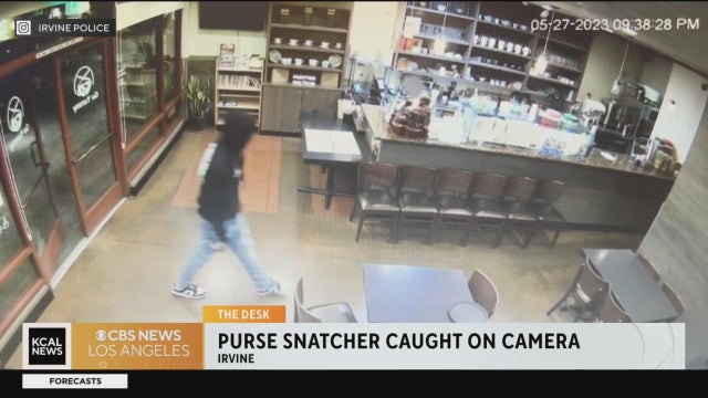 Irvine police shared the restaurant's surveillance video of a purse snatcher in action in hopes to locate the man and to warn how quickly and easily it can happen