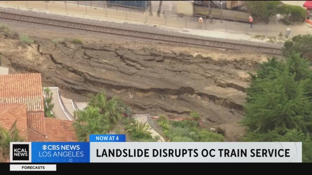 Amtrak and Metrolink service shut down in Orange County once more after a massive chunk of the hillside gave way again in San Clemente. Michele Gile reports.