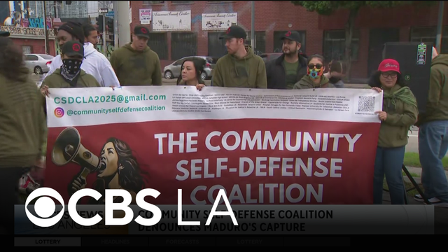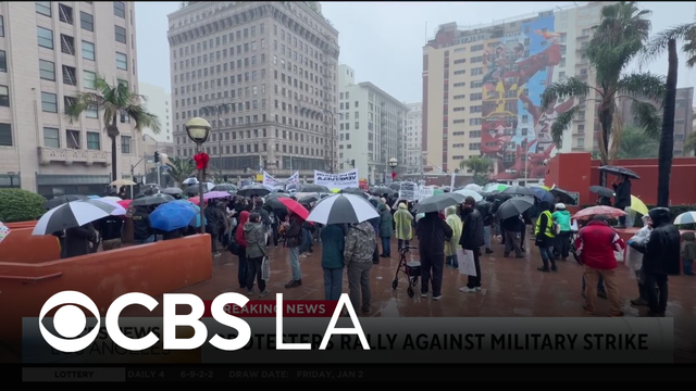 A group of protesters rallied in downtown Los Angeles on Saturday to denounce the military action taken in Venezuela overnight. Lauren Pozen reports.