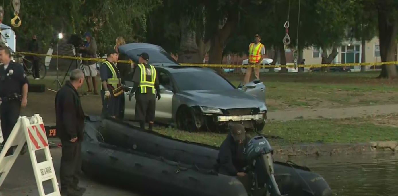 At around 6 a.m., L.A. Fire Department divers pulled an Audi sedan out of the lake. No one was inside.