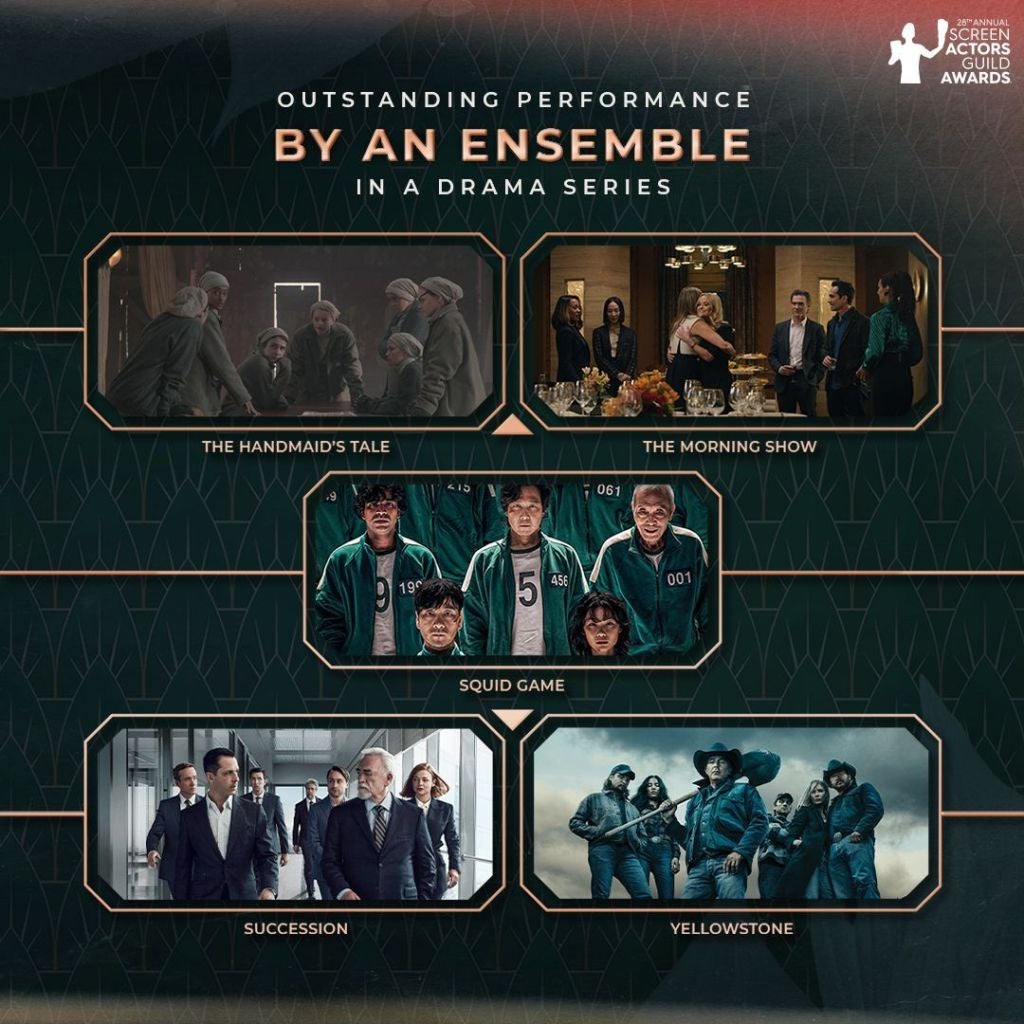 Drama ensemble: "The Handmaid's Tale"; "The Morning Show"; "Squid Game"; "Succession"; "Yellowstone."