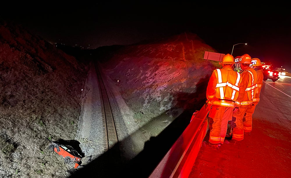 Authorities say the car was going south on Highway 101 when it left the highway, rolled down an embankment and landed on its side along the train tracks. The car's air bags deployed, and the driver, a man in his 20s, was able to get himself out of the car and walk back up to the highway, according to Fire Marshal Rob Rappaport of the Carpinteria Summerland Fire Protection District.
