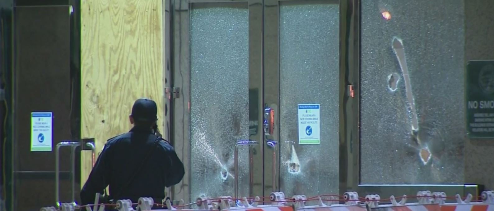 Multiple doors and windows were boarded up early Tuesday morning because of the damage. CBSLA cameras showed several people being detained, but it's unclear if and how many arrests were made. There were no reports of serious injury.