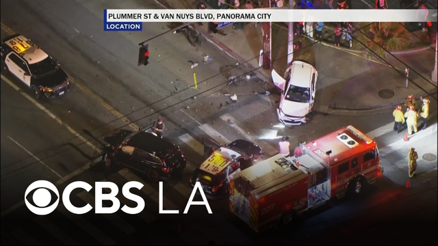 Two pedestrians were injured following a two-car collision at a San Fernando Valley intersection.