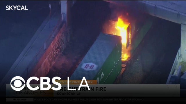 A train cargo container with Amazon branding on the side went up in flames as the train headed to the Union Pacific light rail station downtown LA.