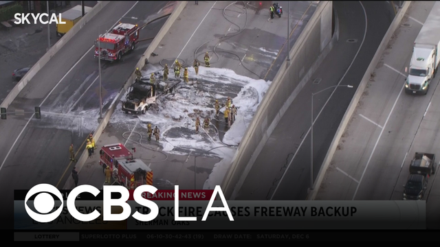 A portion of the 405 Freeway was shut down in Sherman Oaks on Monday afternoon after a truck carrying bales of hay caught fire.