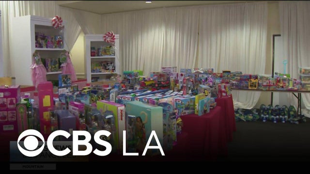 Donated toys and prepared hot meals serve those in need in downtown Los Angeles at a holiday Skid Row event.