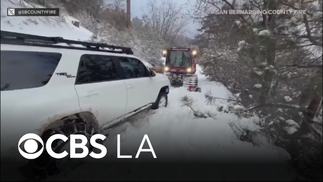 San Bernardino County firefighters rescued a camper and his dog after fresh snowfall stranded them in the mountains.