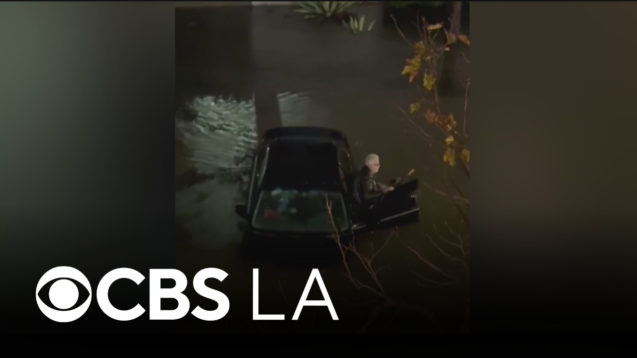Rick Entrikin, 79, was rescued by a young woman who spotted the man getting trapped in the flooded Costa Mesa street. Michele Gile reports.