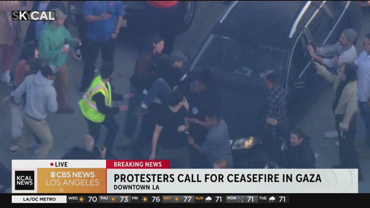 Protesters calling for Israel-Hamas ceasefire took to the 110 Freeway DTLA, blocking all through traffic starting at 9 a.m. By 9:55 a.m., officers were working to detain protestors