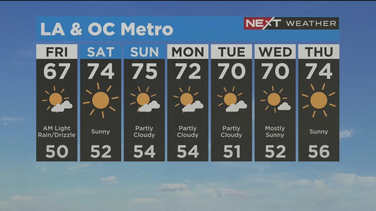 Scattered light drizzle this morning, temperatures reach mid-60s today. Sunny and warm this weekend.