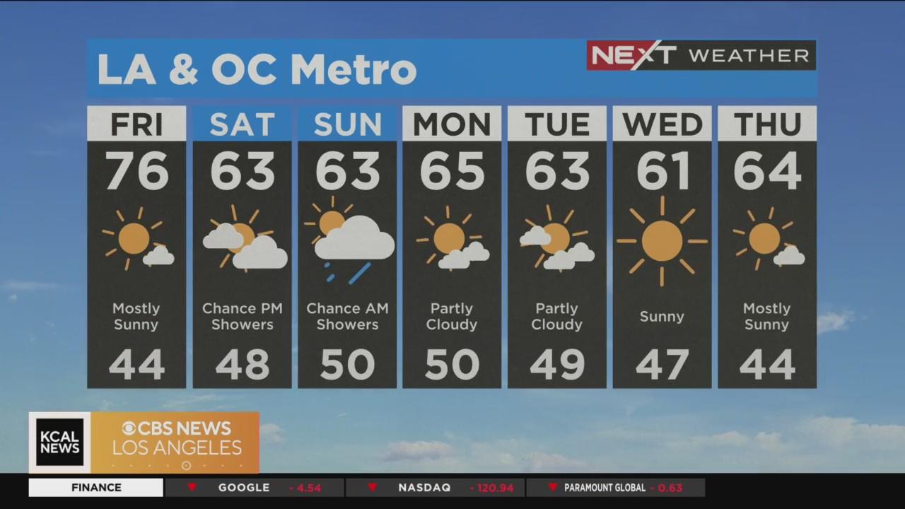 Warm Friday reaching the 70s. Temps drop significantly this weekend, with chance of light showers late Saturday and early Sunday with mountain snow expected.