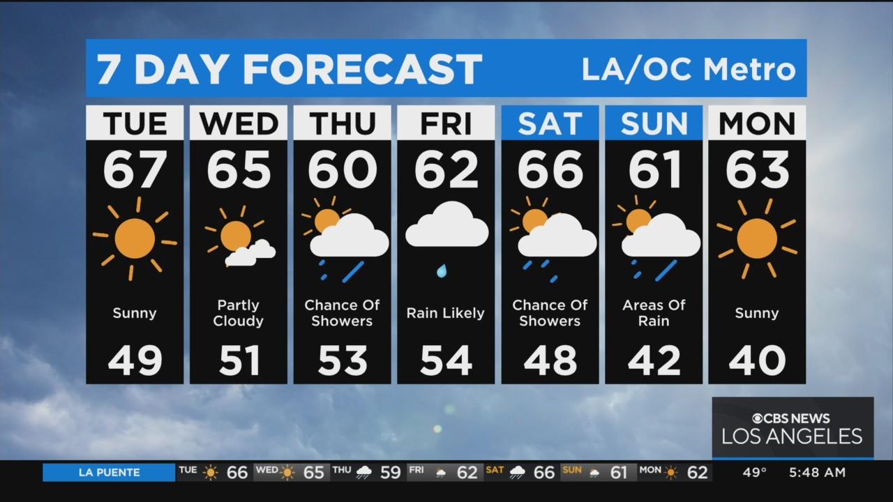 Mostly sunny Tuesday, upper 60s. Rain developing Thursday night into Friday morning. Another system bringing chance of wet weather Saturday and Sunday.