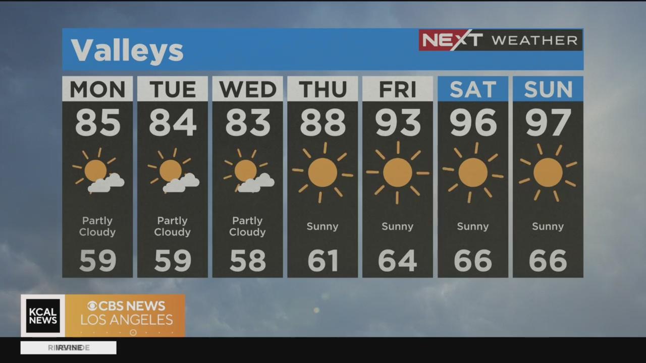 Cool and cloudy Monday morning, sunny afternoon. Windy and dry with elevated fire danger in mountains and deserts. Warming trend starts Thursday leading into hot weekend in Valleys and Inland Empire.