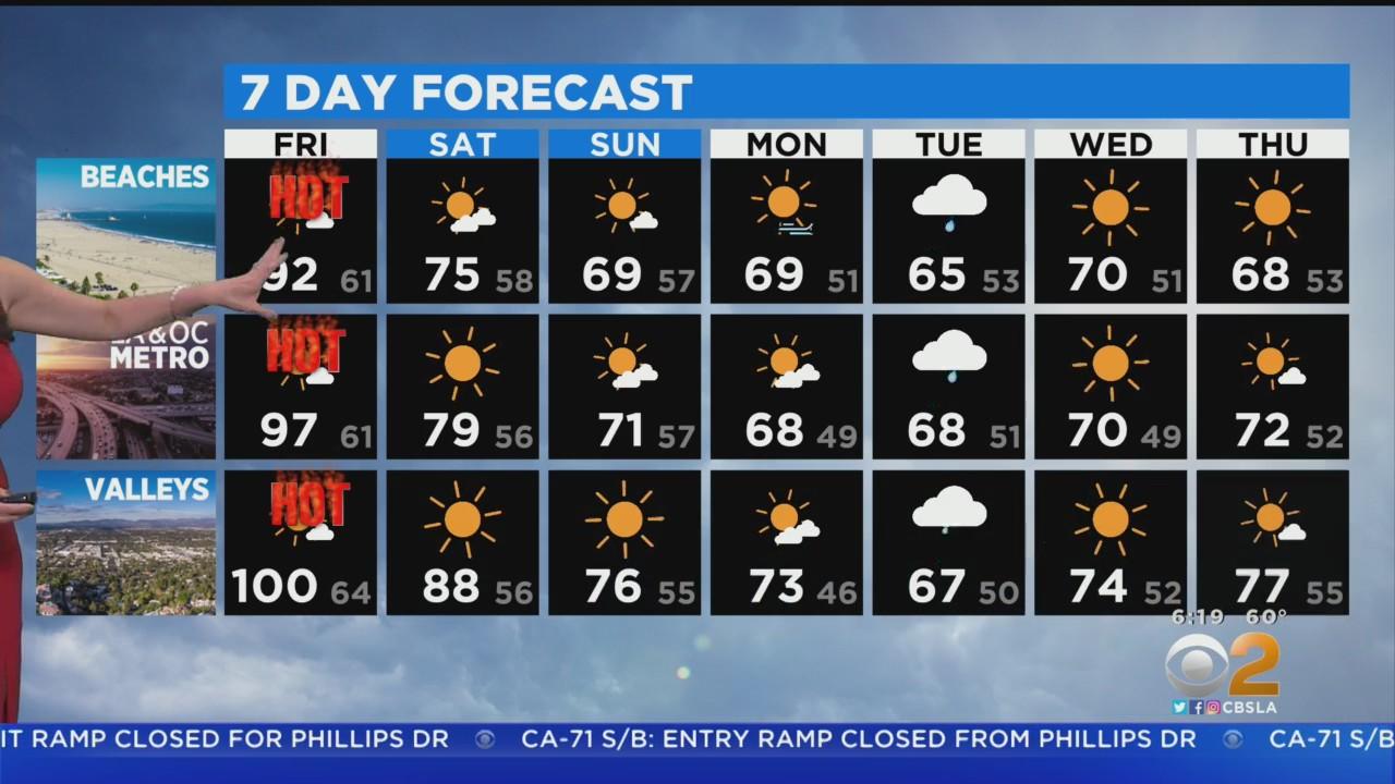 It will be hot, dry and gusty Friday with the possibility of more record heat. A high of 92 for the beaches and 100 for the valleys.