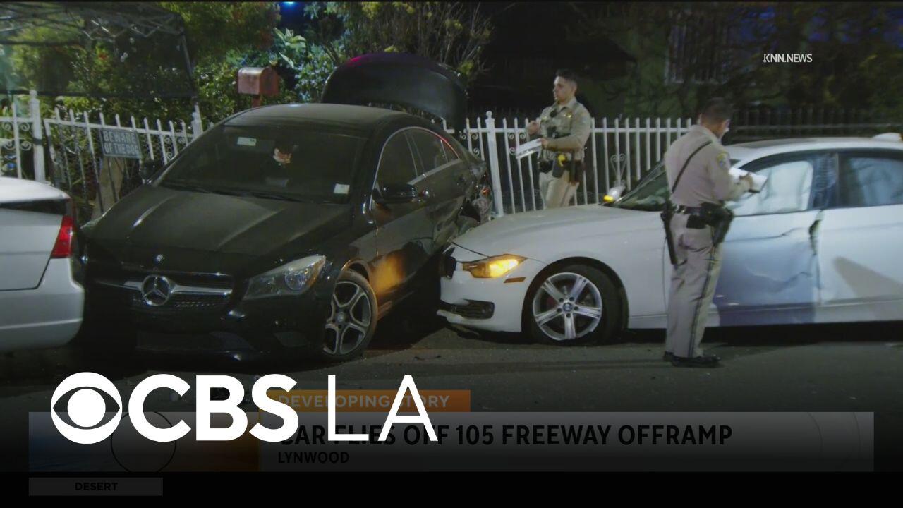 Car flies off 105 Freeway offramp in Lynwood and crashes into other vehicles